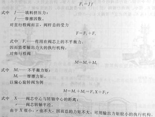 由圖1-10可見,直行程閥中單密封閥不平衡式結構,流開情形下,壓差易把閥芯頂開,故允許壓差??;而角行程閥的閥芯轉動,不平衡力矩為“力x力臂”,因力臂小,力矩小,故允許壓差大。