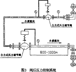 控制系統(tǒng)為穩(wěn)定閥后壓力的系統(tǒng),介質(zhì)為氮?dú)猓到y(tǒng)的初始管道壓力為2800KPa,后工段所需要的最大流量為2000NM3/h。工藝要求是后工段使用介質(zhì)10分鐘后停止使用1小時(shí),并按此方式循環(huán)使用;正常使用時(shí)閥后壓力穩(wěn)定在700KPa,停止使用時(shí)閥后壓力不得高于800KPa。閥后輸送管道長(zhǎng)度為800~1000米左右(如圖3所示)。